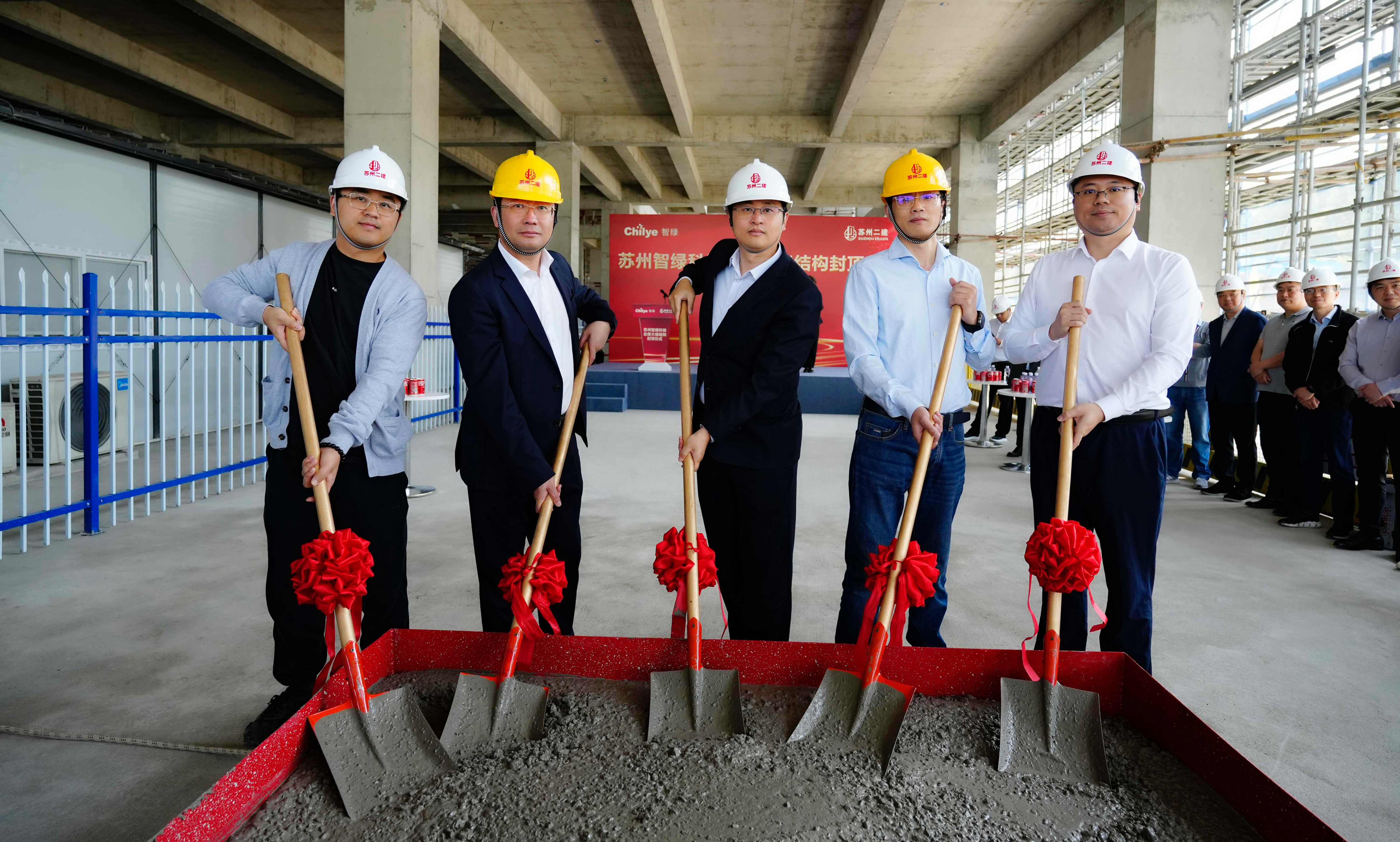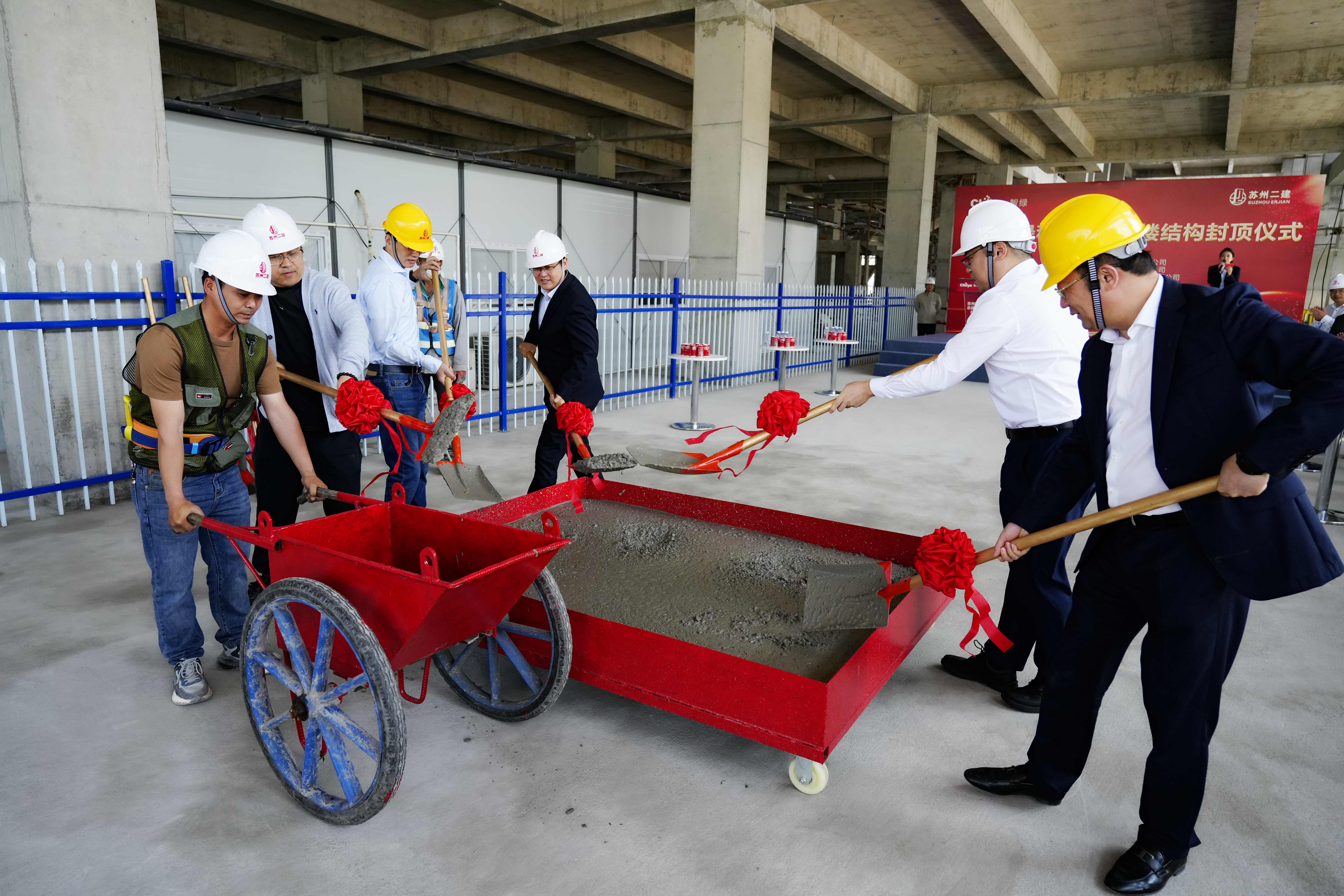高貿(mào)區(qū)管委會(huì)副主任胡恒、園區(qū)行政審批局副局長宋飛、啟迪設(shè)計(jì)集團(tuán)科技產(chǎn)業(yè)研究中心主任潘磊、蘇州二建董事長陳曉鋒以及智綠科技的同仁們齊聚一堂,共同見證了這一激動(dòng)人心的封頂時(shí)刻!